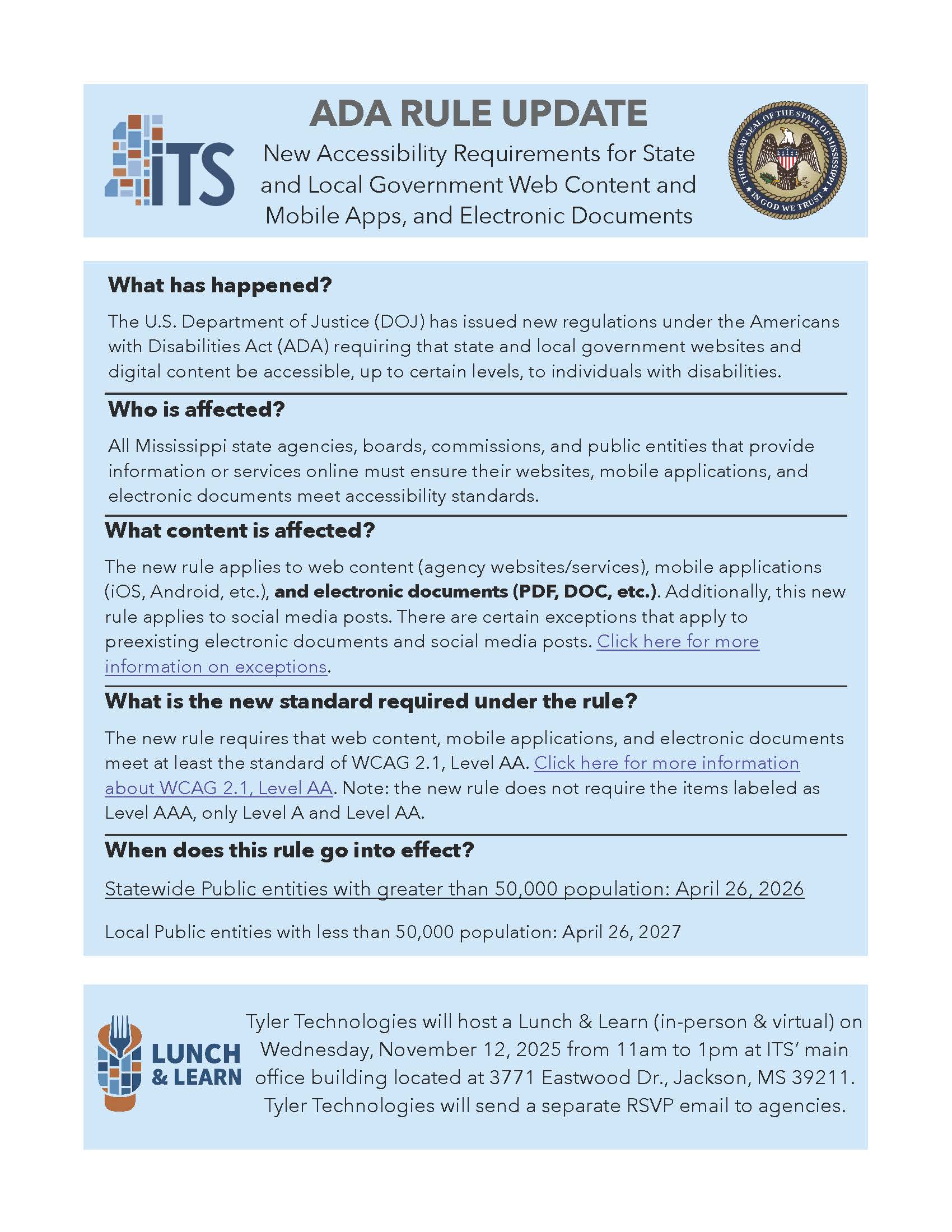 To help agencies prepare, Tyler Technologies will host a Lunch & Learn (in-person & virtual) on Wednesday, November 12, 2025, from 11:00 a.m. to 1 p.m. at the ITS main office (3771 Eastwood Drive, Jackson, MS).